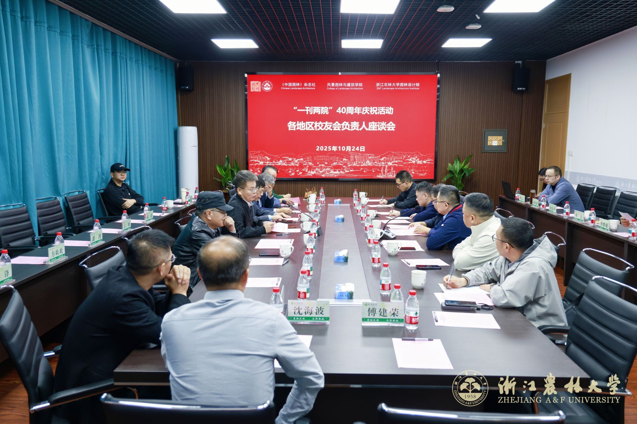 10月24日,值此《中国园林》杂志、风景园林与建筑学院、园林设计院(以下简称“一刊两院”)创立四十周年之际,浙江农林大学园林与建筑行业校友代表座谈会在园林设计院101会议室举办。本次座谈会以“凝聚校友力量,共绘发展蓝图”为主题,汇聚学院与设计院领导、优秀校友代表、荣休教师及教职工代表,共同回顾峥嵘岁月,展望未来征程。