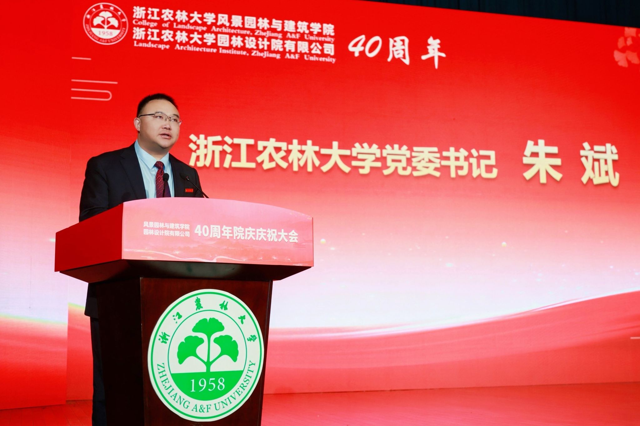 朱斌代表学校致贺词,追溯了园林学院从建系之初的“初心种子”,到成长为国内外具有重要影响力的高水平学院历程。他对学院在立德树人、学科建设、文化传承、社会服务等方面取得的成绩表示肯定,希望学院进一步骤焦人才培养质量、一流学科建设、深化改革创新、强化党建引领、服务乡村振兴,为中华民族伟大复兴贡献园林力量。